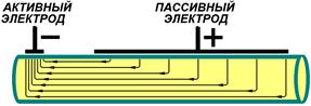 Эффективность раздражения определяется не только абсолютным значением тока, но и плотностью тока под стимулирующим электродом. Плотность тока определяется отношением величины тока, протекающего по цепи, к величине площади электрода. Поэтому при монополярном раздражении площадь активного электрода всегда меньше пассивного (рис.)[Б27].