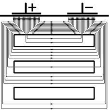 Рис. 210041846. Ветвление тока в ткани при раздражении через наружные (внеклеточные) электроды (схема). Волокна возбудимых клеток (ткани) обведены толстой линией, между ними – межклеточные щели [++421+c62]. Объяснение в тексте. По вышеперечисленным причинам и в первом опыте Гальвани лучше наносить стимул биметаллическим пинцетом на нерв