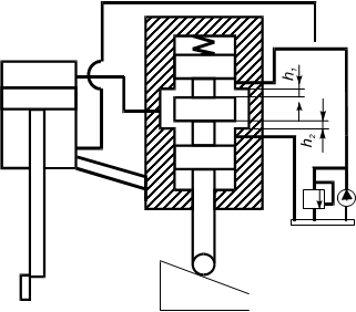Масло попадает в силовой цилидр, штоковую полость и в полость А золотника. Полость Б соединена со сливом. В исходном положении (щуп ни касается копира) под действием пружины золотник смещен вниз увеличивая щель h1 и перекрывая h2.