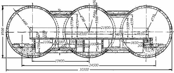 Рис. 3.18 Поперечний переріз трьохсклепінної станції з обробленням із залізобетонних блоків