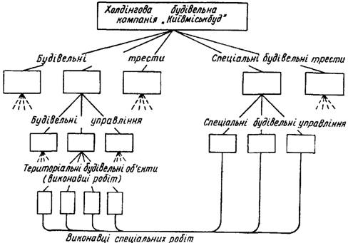 Це акціонерна компанія, що використовує свій капітал для придбання контрольних пакетів акцій інших компаній, акціонерних товариств із метою управління, керівництва і отримання дивідентів. За кордоном холдингом називаються утримувальна компанія, у статутний капітал якої входять контрольні пакети акцій дочірних підприємств. У нашій практиці склалося уявлення як про управляючу структуру, на нижньому рівні якої знаходяться дочірні підприємства; рух акцій при цьому не розглядається. На Заході холдинг формується ринковим шляхом: компанія скуповує пакети акцій і на цій основі створює свій статутний капітал. У нас утворення холдингу в державному секторі відбувається переважно “зверху” завдяки добровільно-примусовому об¢єднання контрольних пакетів акцій підлеглих підприємців. Холдінг знімає з будівельних організацій і підприємств труднощі, пов¢язані з рухом цінних паперів, і може вирішити, наприклад, проблему взаєморозрахунків, коли всі “перебувають на кортеці”, або вишукувати ресурси на стороні, сприяючи тим самим задоволеню спільних інтересів. З організаціоної точки зору холдингові компанії можуть створюватися двома способами. Перший – акціоновані будівельні організації (трести) добровільно об¢єднують свої пакети акцій; другий – за рішенням відповідного державного органу управління. У першому випадку холдинги утворюються за рішенням трудових колективів для вирішення загальних проблем (поблема будівельних матеріалів, відсутності фінансування, розвитку виробничої бази тощо). Кожна будівельна організація (трест) окремо не може реалізувати такі завдання, тому вони приймають рішення після приватизації та сворення акціонерних товариств передати пакети акцій в управління холдингової компанії для вирішення проблем, які виникають. Створення холдингу “зверху” відбувається за рішенням Фонду державного майна України або уряду України. Це стосується, насамперед, державних будівельних організацій і підприємств,приватизація яких відповідно до державної програми обмежана. Житлові, культурно-побутові і виробничі будівлі споруджують різні будівельні організації. Планування, фінансування будівництва, контроль за діяльністю будівельних організацій здійснюється через Державний комітет України у справах містобудування і архітектури (Держкоммістобудування України) та територіальні управління будівництва при обласних і міських держадміністраціях.