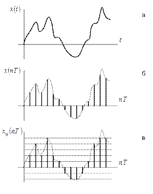 Рис. 1.1. Типы сигналов: а) аналоговый; б) дискретный (последовательность); в) цифровой (квантованная последовательность)