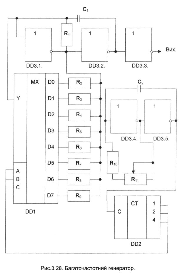 Виключити можливість витоку інформації по ланцюгам джерел живлення можна використовуючи мережеві фільтри, які вмикають між енергетичною мережею та пристроєм споживача. Для подавлення завад в мережевих фільтрах використовують 2 способи: фільтрація режекторними дроселями та екранування мережевої і вихідної обмоток трансформаторів. Серед електроних пристроїв захисту інформації в теперішній час найбільше розповсюдження знайшли генератори шуму, випромінюючи активну широкополосну радіозаваду, яка впливає на вхідні ланцюги радіоприймальних пристроїв. Аналогічні пристрої використовуються для захисту від витоку інформації по електричній мережі та телефонним лініям. Перші генератори шуму звичайно складались з двох мультивібраторів, виконаних на транзисторах. Однак фільтрація подібних сигналів не представляє особливих труднощів. Тому використовуються багаточастотні завади, що збільшує ймовірність закриття корисної інформації, так як необхідно застосування декількох в залежності від кількості використаних частот, точно налагоджених фільтрів. І чим більша кількість частот в багаточастотні й заваді, тим складніше виявити необхідну інформацію. На рис.3.28. наведена схема багаточастотного генератору шуму.