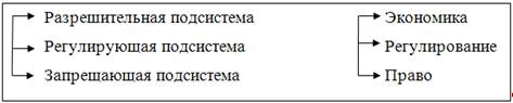 Полученная развертка базиса ОПЭП облегчает проекцию на него множества характеристик таможенной системы. Данный тетрабазис как матрицу можно детализировать, произведя в нем дихотомию (раздвоение) его компонентов, что и осуществляется при его применении для описания реальной динамической таможенной системы, где: • таможенное дело — объект исследования; • организация — как устройство внутреннего и внешнего таможенного пространства; • психология — как психология прошлого опыта и психология будущей деятельности; • право — как правоохранительная и законодательно-правовая деятельность; • экономика — как управленческая таможенная деятельность и фискальная деятельность. На рис. 3 представлен первый уровень системного описания таможенного дела. Чтобы получить второй уровень, необходимо произвести аналогичные (фрактальные – разделение, дробление) операции со всеми четырьмя ее компонентами, с каждой в отдельности. Так, например, компонент "экономика" разобьется на последующую матрицу и примет вид, показанный на рис. 4.