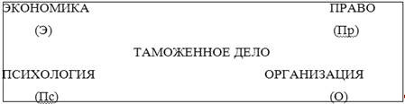 Рис. 2. Таможенная система в виде триад Наиболее устойчивая система — это линия, развернутая в плоскость, так называемая тетрада. Она может образовываться путем раздвоения среднего звена, либо другими способами. Например, регулирование может разделиться на контроль и упорядочение (т. е. на организацию и право). В качестве базисного познавательного описания таможенного дела взят тетрабазис. Он представляет собой плоскую матрицу с четырьмя рядоположенными понятиями — познавательно-регулирующими компонентами: экономика, право, организация и психология (далее - ОПЭП). Наложив на тетрабазис свое упорядоченное и разведенное семантическое множество (компоненты целого), т.е. смысловые обозначения таможенного дела, мы получим следующее системное описание таможенного дела (рис. 3):