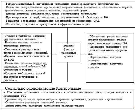 Основные задачи, решаемые таможенными органами можно представить следующим образом. Главная задача – обеспечение экономической безопасности. Решение главной задачи достигается решением частных задач: а) правильной классификацией товаров на основе ТН ВЭД, своевременной корректировкой ТН ВЭД; б) определением страны происхождения и таможенной стоимости; начислением и сбором пошлин, акцизов, НДС, других платежей, реализацией конфискатов; в) контролем за соблюдением законодательства о таможенном деле борьбой с контрабандой, НТП, уклонением от платежей; г) регулированием ВЭД и контролем за экспортом и валютой, ведением таможенной статистики; д) совершенствованием всего таможенного дела (структуры таможенных органов, технологий, управления и кадрового обеспечения); е) эффективной правоохранительной работой, в том числе и охраной таможенной границы и объектов инфраструктуры. На таможенные органы возложены следующие функции, рис. 8.