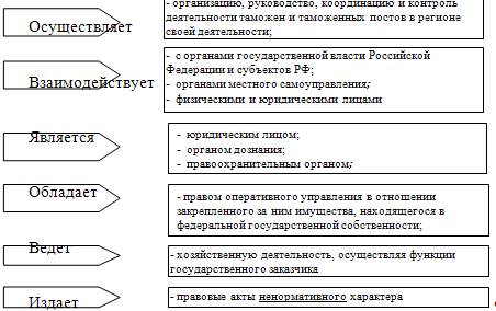Правовой статус таможенного поста, являющегося юридическим лицом, совпадает со статусом таможни. Таможенный пост, не являющийся юридическим лицом, рассматривается как структурное подразделение таможни. Классификация таможенных органов. Положения о специализированных таможенных органах, утверждаемые ФТС России, кроме общих для всех таможенных органов положений, содержат такие положения, которые определяют специализацию региональных таможенных управлений, таможен и таможенных постов или в отношении отдельных товаров, или ограничивающие (конкретизирующие), полномочия таможенных органов по выполнению определенных функций. К специализированным таможенным органам относятся: - экспертно-криминалистические; - оперативные; - кинологические; - тыловые, а также таможенные органы, специализирующиеся на таможенном оформлении и таможенном контроле: - перемещаемых драгоценных металлов и драгоценных камней; - товаров, перемещаемых воздушным, трубопроводным транспортом и по линиям электропередач. В систему таможенных органов входят учреждаемые федеральным органом исполнительной власти (ФТС РФ), уполномоченным в области таможенного дела, учреждения и организации некоммерческого характера, не являющиеся правоохранительными органами для осуществления социально-культурных и других, возложенных на таможенные органы законодательством страны, функций. К ним относятся: - Главный научно-информационный вычислительный центр (ГНИВЦ) - Государственные унитарные предприятия (ФГУП "Ростэк", ФГУП "Волго-терминал", ГПЭП "Астеп") - Государственное образовательное учреждение (РТА "Российская таможенная академия") - учреждения здравоохранения (Центральный клинический госпиталь, Центральная поликлиника, государственные учреждения "Санаторий Победа" и пансионат "Белое солнце").
