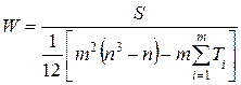 где dj - разность между рангами j -го показателя, указанными двумя экспертами. Чем ближе значение r к единице, тем больше степень согласованности экспертных оценок. Для оценки согласованности мнений группы из m экспертов по п показателям используется коэффициент конкордации W (общий коэффициент ранговой корреляции для группы, состоящей из т экспертов):