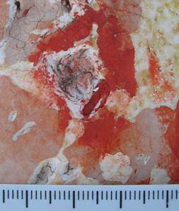Иллюстрация №23. Механическое повреждение с наличием «минус ткани» с разволокнёнными краями и пятно бурого цвета на майке трупа сотрудника ДПС ГИБДД УВД по Орловской области, обнаруженного возле автомобиля ДПС г/н А 0190 57 RUS.