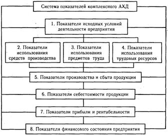 Показатели исходных условий деятельности предприятия характеризуют: а) наличие необходимых материальных и финансовых ресурсов для нормального функционирования предприятия и выполнения его производственной программы; б) организационно-технический уровень предприятия, т.е. производственную структуру предприятия, структуру управления, уровень концентрации и специализации производства, продолжительность производственного цикла, техническую и энергетическую вооруженность труда, степень механизации и автоматизации, прогрессивность технологических процессов и т.д.; в) уровень маркетинговой деятельности по изучению спроса на продукцию, ее конкурентоспособности, рынков сбыта, организации торговли, рекламы и т.д. Показатели приведенной подсистемы оказывают влияние на все остальные показатели хозяйствования и в первую очередь на объем производства и реализацию продукции, ее качество, на степень использования производственных ресурсов (производительность труда, фондоотдачу, материалоотдачу), а также на другие показатели экономической эффективности: себестоимость, прибыль, рентабельность и т.д. Поэтому анализ хозяйственной деятельности надо начинать с изучения этой подсистемы. Основными показателями подсистемы 2 являются фондорентабельность, фондоотдача, фондоемкость, среднегодовая стоимость основных средств производства, амортизация. Наряду с этими показателями большое значение имеют и другие, например, выработка продукции за один машино-час, коэффициент использования наличного оборудования и т.д.От них зависит уровень фондоотдачи и фондорентабельности. В подсистеме 3 основными показателями являются материалоемкость, материалоотдача, стоимость использованных предметов труда за анализируемый отрезок времени. Они тесно связаны с показателями подсистем 5, 6, 7, 8. От экономного использования материалов зависят выход продукции, себестоимость, а значит, и сумма прибыли, уровень рентабельности, финансовое состояние предприятия. Подсистема 4 включает в себя показатели обеспеченности предприятия трудовыми ресурсами, полноту использования фонда рабочего времени, фонда заработной платы, показатели производительности труда, прибыли на одного работника и на рубль заработной платы и др. В пятый блок входят показатели производства и реализации продукции: объем валовой, товарной и реализованной продукции в стоимостном, натуральном и условно-натуральном измерении, структура продукции, ее качество, ритмичность производства, объем отгрузки и реализации продукции, остатки готовой продукции на складах. Они очень тесно связаны с показателями всех последующих блоков. Показатели шестого блока — это общая сумма затрат на производство и реализацию продукции, в том числе по элементам, статьям затрат, видам продукции, центрам ответственности, а также затраты на рубль товарной продукции, себестоимость отдельных изделий и др. От уровня себестоимости продукции непосредственно зависят показатели седьмого блока: прибыль предприятия, уровень рентабельности. К последней подсистеме (блок 8) относятся показатели, которые характеризуют наличие и структуру капитала предприятия по составу его источников и формам размещения, эффективность и интенсивность использования собственных и заемных средств. К этой подсистеме относятся т