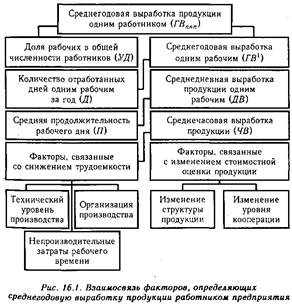 Дополнение: Для оценки уровня производительности труда применяется система обобщающих, частных и вспомогательных показателей. К обобщающим показателям относятся среднегодовая, среднедневная и среднечасовая выработка продукции одним рабочим, а также среднегодовая выработка продукции на одного работающего в стоимостном выражении. Частные показатели — это затраты времени на производство единицы продукции определенного вида (трудоемкость продукции) или выпуск продукции определенного вида в натуральном выражении за один человеко-день или человеко-час. Вспомогательные показатели характеризуют затраты времени на выполнение единицы определенного вида работ или объем выполненных работ за единицу времени. Наиболее обобщающим показателем производительности труда является среднегодовая выработка продукции одним работающим. Величина его зависит не только от выработки рабочих, но и от удельного веса последних в общей численности промышленно-производственного персонала, а также от количества отработанных ими дней и продолжительности рабочего дня (рис. 16.1).
