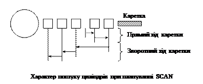 При позиціонуванні каретки з магнітними головками наступним вибирається запит, для якого необхідне мінімальне переміщення каретки. Першим обслуговується запит з найменшим часом пошуку циліндра, якщо навіть цей запит не є першим в черзі. Має місце різка дискримінація певних запитів. Звернення до диску виявляють тенденцію концентруватись, в результаті запити до самих внутрішніх, або самих зовнішніх доріжок можуть обслуговуватись значно гірше, ніж до середніх доріжок. Краща пропускна здатність, ніж FCFS, і найкращий середній час відповіді при помірних навантаженнях. Велика дисперсія, тобто погана передбачуваність, не підходить для інтегрованих систем, але добра в пакетних системах, де основне – пропускна здатність. 3. SCAN (сканування). Каретка з головками рухається туди і назад над поверхнею, обслуговуючи всі запити, що зустрічаються на шляху. Каретка змінює напрям руху, якщо в біжучому напрямку більше немає запитів для обслуговування.