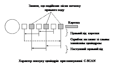 Найважливіша риса - невелика дисперсія часу відповіді в порівнянні з принципом SSTF або звичайним варіантом SCAN. Ця стратегія виключає можливість безмежного відкладання, яке звичайно виникає у випадку надходження великої кількості запитів на звертання до біжучого циліндра. Вона передбачає запам’ятовування тих запитів, що надійшли при зворотному ході каретки. 5. С-SCAN (циклічне сканування). Каретка рухається в напрямку до внутрішньої доріжки. Якщо попереду більше нема запитів для обслуговування, каретка стрибком повертає до початку, обслуговує запит, найближчий до зовнішньої доріжки, а потім обслуговує рух до середини.