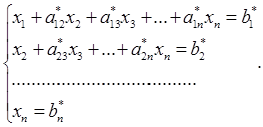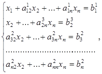 четвертий крок – помножимо друге рівняння на а322 та віднімемо від третього рівняння (щоб виключити змінну х2 з другого рівняння) ................................. помножимо друге рівняння на аn22 та віднімемо від n-ого рівняння (щоб виключити змінну х2 з n-ого рівняння)