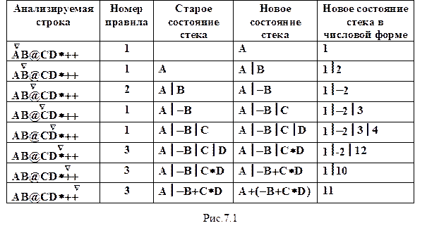 На рис. 7.1 показан пример интерпретации строки ПОЛИЗа AB@CD*++, полученной из инфиксного выражения A+(-B+C*D). Значения в стеке отделены друг от друга вертикальной чертой.