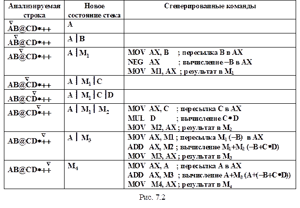На рис. 7.2 показан пример генерирования команд для уже известной нам строки ПОЛИЗа AB@CD*++.