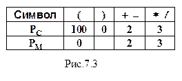 По окончании входной строки содержимое магазина переписывается в строку ПОЛИЗа. (Если при этом в магазине останутся открывающие скобки, то это также является признаком ошибки в записи исходного выражения). На рис. 7.3 представлена таблица приоритетов операций и скобок для упрощенных арифметических выражений, а на рис. 7.4 разобран по шагам пример перевода в ПОЛИЗ инфиксного выражения по методу Замельсона–Бауэра. (На рис. 7.4 вершина магазина операций расположена справа).