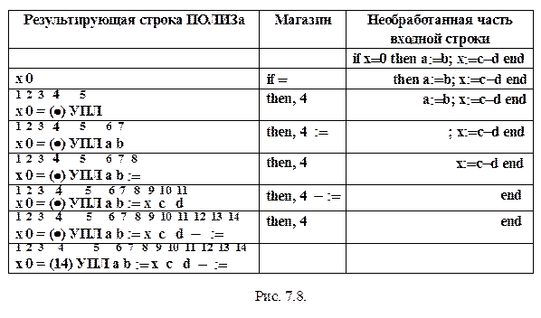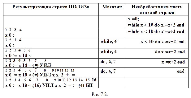 На рис. 7.8. представлены отдельные шаги перевода в ПОЛИЗ простейшего оператора цикла.