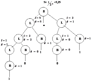 L B B Здесь индексы у нетерминалов L1 и L2 использованы для того чтобы различить вхождения одноименных нетерминалов в правой и левой частях правил вывода. Ниже построено дерево вывода для числа 101.01, а в скобках получено значение числа в десятичной системе счисления.