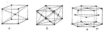 Рис. 6. Порядок расположения атомов в простых реше-ках: а— объемно-центрированной кубической (9 атомов); б— гранецентрирован-ной кубической (14 атомов); в — гексагональной плотноупакованной (17 атомов). рактерными для большинства металлов (рис. 6) или сложными кристаллическими решетками. Линии на рис. 6 условные. Атомы 'в действительности колеблются возле положений равновесия, т. е. в узлах кристаллической решетки. Расстояние между атомами в кристаллической решетке измеряется в ангстремах (1А==10~9 нм). У большинства металлов расстояние между атомами находится в пределах 0,28—6,8 нм. Наименьший объем кристалла, дающий представление об атомной структуре металла во всем объеме, называется элементарной кристаллической ячейкой. Получаемые обычным способом металлы представляют собой поликристаллические тела, состоящие из множества элементарных ячеек, ориентированных относительно друг друга самым различным образом. Ячейки имеют неправильную форму и называются кристаллитами, или зернами. Если сочетание элементарных ячеек правильное, по расположению атомов повторяющее элементарную ячейку, то образовавшееся тело называется монокристаллом. Металлические сплавы, как и металлы, имеют кристаллическое строение. При этом в зависимости от взаимодействия компонентов они подразделяются на твердые растворы, химические соединения и механические смеси. Твердые растворы образуются тогда, когда при сплавления атомы одного элемента в разных количествах входят в кристаллическую решетку другого элемента, не изменяя в значительной мере ее формы. Элемент, сохранивший форму своей решетки, называется растворителем, а элемент, атомы которого вошли в эту решет- • ку,—растворенным. По размещению атомов растворенного элемента в решетке растворителя различают твер- дые растворы замещения (атомы растворенного элемента располагаются в узлах решетки растворителя) и твердые растворы внедрения (атомы растворенного элемента находятся между атомами растворителя и узлами его решетки). Если входящие в состав твердого раствора замещения компоненты имеют близкое строение решеток и атомов, то такие элементы могут образовывать непрерывный ряд твердых растворов, т. е. количество замещенных атомов может изменяться от 0 до 100 %. При этом считается, что растворителем является тот элемент, содержание которого в сплаве более 50 %. Растворы внедрения образуются элементами, сильно отличающимися строением решетки и размерами атомов.Твердые растворы являются гомогенными (однородными) сплавами, так как их структура представляет собой одинаковые по составу и свойствам зерна. Свойства твердых растворов ib значительной степени могут отличаться от свойств входящих в него компонентов. Все металлы в той или иной степени могут растворяться один в другом, образуя твердые растворы. Химические соединения образуются при химическом взаимодействии атомов компонентов сплава, сопровождающемся значительным тепловым эффектом. При этом кристаллическая решетка химического соединения и все его свойства могут резко отличаться от решетки и свойств компонентов. В огличие от твердых растворов химические соединения обычно образуются между компонентами, имеющими большое различие в электронном строении атомов. Типичными примерами химических соединений являются соединения магния с 