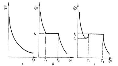 Рис. 7. Кривые охлаждения аморфного (а), кристаллического тела (б) и металлов (в), где /„ fn— температура кристаллизации и переохлаждения, "С; (Ti—Та) —время кристаллизации, с. Строение кристаллического тела обусловливает следующие особенные их свойства по сравнению с аморфными: различие свойств монокристаллов в различных направлениях, т. е. анизотропность, или векториальность, свойств; наличие плоскостей скольжения, приложение внешних сил приводит к скольжению (сдвигу) одной плоскости относительно другой; •существование критической температуры при затвердевании или плавлении, при которой происходит переход из жидкого (расплавленного) состояния в твердое или наоборот. Переход металла из жидкого состояния в твердое называется кристаллизацией, а из твердого в жидкое — плавлением. Если образование кристаллов происходит из жидкости при ее охлаждении, то этот процесс называется первичной кристаллизацией, если образование кристаллов идет в твердом состоянии тела,—вторичной кристаллизацией. Процессы кристаллизации графически изображают кривыми, строящимися в координатах температура — время (рис. 7). Явление переохлаждения в кристаллизующемся металле объясняется тем, что в период затвердевания про- исходит резкие снижение подвижности атомов, вследствие чего скачкообразно изменяется его внутренняя энергия. Это сопровождается выделением тепла, которое подогревает жидкую ванну и некоторое время (7'!— Тч) удерживает ее температуру постоянной, пока жидкость полностью не закристаллизуется. Степень переохлаждения тем больше, чем больше скорость охлаждения. Русский ученый-металлург Д. К. Чернов в 1878 г. установил, что процесс кристаллизации состоит из нескольких стадий. Первая стадия — образование зародышей (центров) кристаллизации. На последующих стадиях из этих центров образуются дендриты (древовидные образования), которые, срастаясь, образуют зерна (кристаллиты). При этом они не имеют правильной геометрической формы, так как в местах соприкосновения растущих кристаллов рост граней прекращается. Величина зерна металла — важнейшая характеристика, которая определяет все основные его свойства. Мелкозернистый металл имеет более высокие характеристики твердости, прочности, ударной вязкости, но у него пониженная электропроводность, хуже магнитные свойства. Размер зерна зависит от количества центров кристаллизации и скорости роста кристаллов (скорости охлаждения). Чем больше центров кристаллизации и меньше скорость их роста, тем меньше будет зерно. Образование центров кристаллизации может происходить самопроизвольно или на имеющихся в жидком металле частицах примесей, что используется при модифицировании — введении в жидкий металл примесей (модификаторов). На образование центров кристаллизации, а следовательно, и величину зерна влияет степень переохлаждения tv—i-n (см. рис. 7). Чем больше степень переохлаждения, тем больше центров кристаллизации и мельче образующееся зерно.