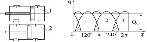Для получения суммарной мгновенной подачи необходимо сложить ординаты синусоид на участках, где они накладываются друг на друга. Степень неравномерности подачи равна (при