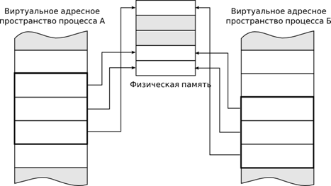 Для операционной системы этот способ является наиболее простым — ведь все страницы виртуальной памяти процессов в любом случае проецируются на какую-то область физической памяти — так почему бы на ту же область не проецировать часть адресного пространства другого процесса? Самое важное, что такое взаимодействие не требует каких-либо накладных расходов, процессы обмениваются информацией со скоростью обращения к памяти. Однако для пользователя такой способ межпроцессного взаимодействия является труднодоступным. Во-первых, программы, взаимодействующие таким образом, должны изначально содержать соответствующий код — с помощью специальных системных вызовов обе программы должны обозначить участки своих адресных пространств, предназначенные для обмена информацией. Другая сложность состоит в том, что разделяемая память сама по себе не содержит средств синхронизации, программы должны согласованно изменять общий участок памяти, чтобы не испортить данные; обычно для этих целей применяются семафоры и аналогичные механизмы синхронизации. Таким образом, разделяемая память — наиболее быстрый способ обмена, но при этом малопригодный для широкого использования. Обычная сфера применения разделяемой памяти — специализированные высокопроизводительные программы. Стоит также обратить внимание на явную аналогию разделяемой памяти и исполнения множества потоков в рамках одного процесса — в UNIX эти инструменты построения программ используются редко и только в связи с высокопроизводительными вычислениями и вводом-выводом.