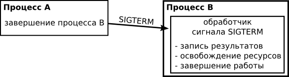 Сигналы — одно из традиционных средств межпроцессного взаимодействия в UNIX. Сигнал может быть отправлен процессу операционной системой или другим процессом. Операционная система использует сигналы для доставки процессу уведомлений об ошибках и неправильном поведении. При получении сигнала исполнение процесса приостанавливается и запускается специальная подпрограмма — обработчик сигнала. Обработчики сигналов могут быть явно определены в исходном тексте исполняемой программы, если же они отсутствуют, а также в некоторых специальных случаях используется стандартный обработчик, определённый операционной системой. У сигнала есть только одна характеристика, несущая информацию — его номер (целое число). Иначе говоря, сигналы — это заранее определённый и пронумерованный список сообщений. Для удобства использования каждый сигнал имеет сокращённое буквенное имя. Список сигналов и их имён стандартизован и практически не отличается в различных версиях UNIX. Для отправки сигналов процессам используется специальный системный вызов kill и одноимённая ему пользовательская утилита. Сигнал завершения процесса, как правило используется для корректного завершения его работы. Пример использования сигнала показан на рисунке Рисунок 1.30, «Пример использования сигнала SIGTERM» Рисунок 1.30. Пример использования сигнала SIGTERM
