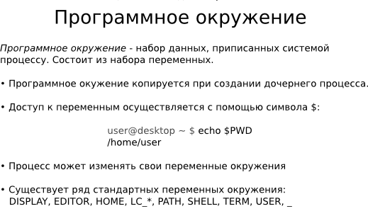В командной оболочке можно просматривать и изменять переменные окружения, которые соответствуют процессу оболочки. Программы могут исполняться по-разному, в зависимости от значений переменных окружения: user@desktop ~ $ dateПтн Ноя 5 16:20:16 MSK 2004user@desktop ~ $ LC_TIME=C dateFri Nov 5 16:20:23 MSK 2004В последнем примере пользователь присвоил некоторое значение переменной окружения в командной строке перед именем команды. Командный интерпретатор, увидев «=» внутри первого слова командной строки, приходит к выводу, что это — операция присваивания, а не имя команды, и запоминает, как надо изменить окружение команды, которая последует далее. Переменная окружения LC_TIME предписывает использовать определенный язык при выводе даты и времени, а значение "C" соответствует стандартному системному языку (чаще всего — английскому). Для получения значения переменной окружения необходимо воспользоваться символом «$»: user@desktop ~ $ echo $PWD/home/user