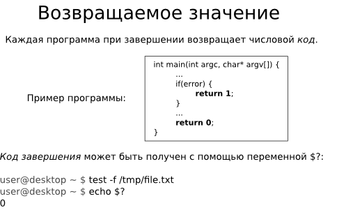 Каждый процесс при завершении возвращает своему родительскому процессу специальный код завершения программы. Этот код может использоваться для получения результата выполнения программы и для проверки корректности её выполнения (возврата кода ошибки).