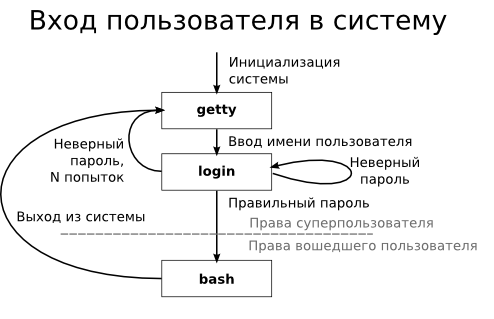 В UNIX сеанс работы пользователя начинается с его аутентификации и заканчивается его выходом из системы. При входе в систему выполняется следующая последовательность действий (см. Рисунок 2.27, «Регистрация пользователя в системе»):