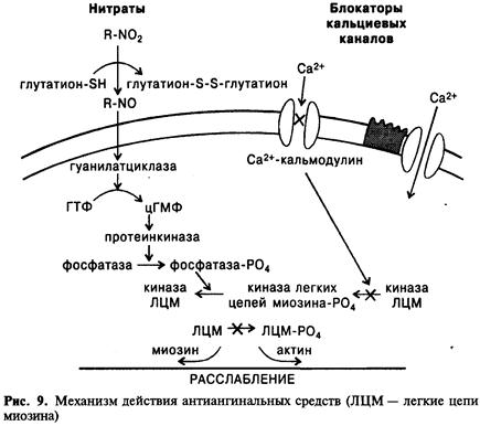 Нитроглицерин был синтезирован в 1846 г. итальянским химиком Асканио Собреро. Этот ученый заметил, что нитроглицерин при приеме под язык в малых дозах вызывает головную боль. Спустя год Константин Геринг определил терапевтические дозы при загрудинной боли и получил таблетки нитроглицерина. В 1857г. известный врач из Эдинбурга Томас Лаудер Брунтон открыл способность амилнитрита купировать загрудинную боль при стенокардии через 30 — 60 с после ингаляционного применения. В 1879 г. Уильям Мэррил опубликовал в английском журнале «Ланцет» серию статей, в которых описал гемодинамические эффекты нитроглицерина и обосновал его назначение под язык для купирования приступов стенокардии. По иронии судьбы одним из первых пациентов, принимавших нитроглицерин, был изобретатель динамита Альфред Нобель. Эфиры азотной кислоты имеют группу — С — О — NO2, эфиры азотистой кислоты — группу —,ЗС — О — N=O. Нитроглицерин — летучая маслянистая жидкость, взрывоопасен. В состав таблеток для повышения стабильности включена микрокристаллическая целлюлоза. Срок хранения таблеток нитроглицерина составляет 2 мес. после того, как больной открыл стеклянный пузырек с резиновой пробкой. Высокомолекулярные нитраты длительного действия (изосорбида динитрат, изосорбида мононитрат) представляют собой стабильные твердые вещества. Гемодинамические эффекты нитратов аналогичны действию эндотелиального сосудорасширяющего фактора — окиси азота (NO). NO образуется в эндотелии артерий и вен в процессе метаболизма аргинина, как липофильное вещество быстро проникает в гладкие мышцы. Активирует цитозольную гуанилатциклазу с увеличением продукции цГМФ. Этот циклический нуклеотид, вызывая через систему протеинкиназ дефосфорилирование киназы легких цепей миозина, препятствует образованию актомиозина (рис. 9). Период полуэлиминации NO — всего 6 — 30 с. Окись азота в большем количестве образуется в артериях, чем в венах, но гуанилатциклаза вен проявляет к ней максимальную чувствительность.