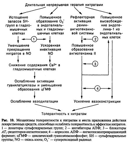 Критерии эффективности нитратов — легкая головная боль, увеличение частоты сердечных сокращений на 7 — 10 в мин, снижение систолического АД на 10 — 15 %, уменьшение частоты и количества приступов стенокардии, рост толерантности к физической нагрузке, исчезновение эпизодов ишемии по данным мониторной регистрации ЭКГ. Примерно 1/4 больных стенокардией изначально рефрактерна к лечению нитратами. При регулярной терапии у 50 — 60% больных развивается толерантность (привыкание) к нитратам. Сначала толерантность возникает к гемодинамическим эффектам, затем — к антиангинальному и противоишемическому влиянию. В наибольшей степени толерантность вызывают нитраты длительного действия. Например, через 8 ч после наложения пластыря с нитроглицерином («Нитродерм») появляется перекрестная толерантность к нитроглицерину, принимаемому под язык. При назначении изосорбида динитрата по 80 мг 1 раз в день толерантность не развивается, применение этого средства два раза в день вызывает толерантность через 2 нед., в случае приема четыре раза в день толерантность наступает спустя 1 нед. Постоянная внутривенная инфузия нитроглицерина в блоках интенсивной терапии сопровождается толерантностью у 65 % больных. Механизмы толерантности к нитратам следующие (рис. 10): · нарушается восстановление нитратов вследствие истощения ресурсов восстановленного глутатиона в эндотелии сосудов (в процессе преобразования группы — NO2в группу — NO сульфгидрильные группы глутатиона окисляются в дисульфидные группы); · NO быстро окисляется в пероксинитрильный радикал; · снижается чувствительность гуанилатциклазы к действию NO, ускоряется инактивация цГМФ фосфодиэстеразой; · из эндотелия выделяется сосудосуживающий фактор — эндотелин-1; · происходит рефлекторная активация симпатической нервной системы (повышается концентрация сосудосуживающих веществ — катехоламинов, ренина, ангиотензина II); · ухудшается почечный кровоток с ростом объема циркулирующей крови. Для предупреждения толерантности используют следующие методы: · увеличивают дозу нитратов, что обеспечивает временный эффект; · назначают нитраты средней продолжительности действия непосредственно перед ожидаемой физической нагрузкой, с интервалом 6 — 8 ч (больные стабильной стенокардией не получают препараты на ночь); · чередуют прием нитратов и блокаторов кальциевых каналов на протяжении суток; · применяют корректоры — донаторы сульфгидрильных групп (N-ацетилцистеин, метионин), ингибиторы ангиотензинпревращающего фермента (каптоприл, эналаприл, периндоприл), блокаторы рецепторов ангиотензина II (лозартан), мочегонные средства. После окончания антиангинального действия разовой дозы нитратов может возникать синдром «раннего отрицательного последействия» — обострение клинически выраженной или бессимптомной ишемии миокарда, рост АД, ударного и минутного объемов крови, удлинение периода изгнания.