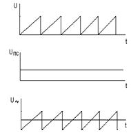 Рисунок 4.2 – Представление пилообразного напряжения в виде двух составляющих Пример. С помощью милливольтметра с закрытым входом измеряется цифровой сигнал (импульсная последовательность амплитудой Um, длительность импульсов tи, период следования Т). Прибор имеет преобразователь пиковых значений и среднеквадратическую шкалу. Показание прибора Ап = 50 мВ. Определить амплитудное (Um), среднеквадратическое {Uск) и средневыпрямленное (Ucв) значения измеряемого напряжения. Учитывая (4.7) и (4.6), запишем