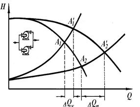 На практиці використовують паралельне й послідовне з’єднання насосів. У випадку, якщо продуктивності одного насосу не вистачає, то вмикають в роботу два насоси, які з'єднують паралельно. Графічна залежність сумарної характеристики при паралельному з’єднанні насосів залежить від крутизни характеристики мережі. Для пологої характеристики мережі паралельне включення насосу більш ефективне, ніж для крутої характеристики мережі (рис. 46), тобто