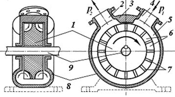 1 – робоче колесо; 2, 4 – нагнітальний і всмоктувальний патрубки; 3 – роздільник потоків; 5 – кільцевий відвід; 6 – міжлопатеві канали; 7 – лопатка; 8 – корпус; 9 – вал.
