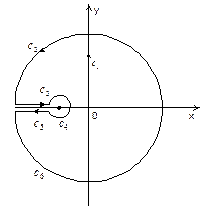 Согласно лемме 3 интегралы по контурам с 2 и с 6 при R ®¥ стремятся к нулю. Легко показать, что интеграл по контуру с 4 при r ®0 также стремится к нулю, а интегралы по с 3 и с 5 противоположны по знаку. Таким образом, в пределе (R ®¥, r®0) получим