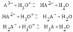 Значения [HA], [H2A] и [H3A] выражают через концентрационные константы ионизации кислоты и известные значения [H+] из соответствующих уравнений. В расчетных формулах (кроме уравнений реакций) для упрощения вместо иона гидроксония Н3О+ обычно пишут Н+, подразумевая, что в растворе протон существует в сольватированном состоянии.