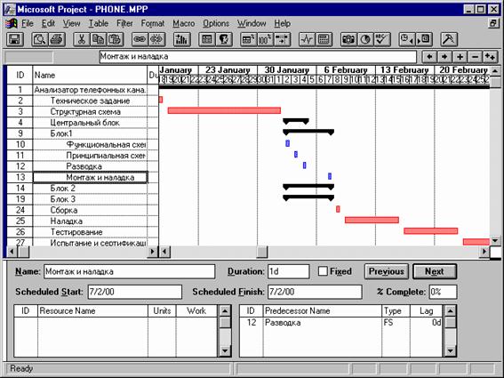 Рис.87. Пример экрана программы Microsoft Project. В правой части экрана приведена диаграмма Гантта (сетевой график) проекта, которая позволяет видеть длительность задач и их взаимосвязи. При помощи этой диаграммы можно обнаружить задачи, которые существенно влияют на время выполнения всего проекта. На рис.88 приведен фрагмент экрана со списком ресурсов, необходимых для реализации проекта "Анализатор телефонных каналов".
