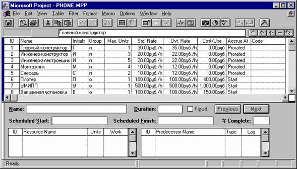 Рис.88. Ресурсы, необходимые для реализации проекта "Анализатор телефонных каналов" В столбике Max. Units указано количество единиц ресурсов, доступное для реализации проекта. В столбике Std. Rate – стандартная стоимость использования ресурса в течении часа, а в столбике Ovt.Rate – стоимость сверхурочного использования ресурса. Таким образом, пакет программ Microsoft Project позволяет составить список задач проекта, разделить задачи на подзадачи, задать последовательность их выполнения, определить стоимость выполнения всего проекта, исходя из стоимости ресурсов. Кроме того, что особенно важно, назначить ресурсы (работников и оборудование) конкретным задачам проекта. Особо следует обратить внимание на то, что если менеджер проекта одновременно реализуется несколько однотипных проектов, то объединив несколько проектов в один, можно выполнять распределение ресурсов между проектами.
