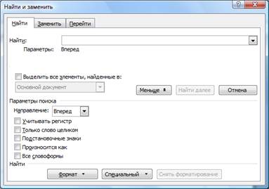 Окно ‘Найти и заменить’ Окно может быть в сокращенном формате или расширенном. Можно искать вперед или назад. Поиск выполняется циклически. Найти текст с учетом регистра и/или слово целиком. Можно искать не только текст как в других редакторах, но и · формат шрифта, абзаца; · текст, написанный на каком-то конкретном языке, например, английском; · параметров табуляции; · спецсимволы: знак абзаца или табуляции, цифра или буква, тире или дефис и т.п. Можно заменять отдельные параметры шрифта, абзаца и т.п. или на спецсимволы. Осуществлять переходы на страницы, разделы, строки и другие элементы. Переходить на закладки.