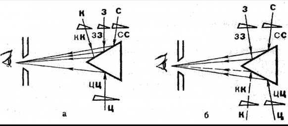 Кривая 1 - спектр отражения исследуемого образца. Кривая 2 - спектр излучения стандартного источника света. Перемножив ординаты кривой 1 на ординаты кривой 2, получим кривую 3, характеризующую спектральный состав света, отраженного от исследуемого образца при данном освещении. Кривые 4, 5 и 6 – стандартные кривые сложения основных цветов X, Y и Z системы МКО. Перемножив ординаты этих кривых на соответствующие ординаты кривой 3, получим кривые 7, 8 и 9, характеризующие количества основных цветов в световом потоке, отраженном от исследуемого образца, т.е. координаты цвета.