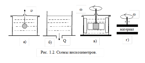 Основные реологические уравнения для простых моделей имеют вид: N-модель: Модель Максвелла описывает основные закономерности релаксации упругих напряжений. Модель Кельвина (Кельвина – Фойгта) описывает закономерности запаздывания упругой деформации. Модель Бингама (Бингама-Шведова) описывает вязкопластическое течение материала. Течение материала происходит только при превышении предельного напряжения сдвига. Существуют и более сложные модели. 1.2. Реометрические исследования. Рассмотрим конструкции вискозиметров, в которых определение реологических констант исследуемой среды производится путем ее непрерывного деформирования. Схемы приборов представлены на рис. 1.2. Приборы, использующие метод исследования реологических свойств дисперсных систем по всплыванию (погружению) сферического тела (шара) (рис.1.2а). Этот метод основывается на применении закона Стокса.