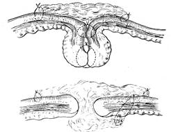 Рис. 15. Ушивание перфорации двухрядным швом в поперечном направлении (вверху) и способ Оппеля-Поликарпова (внизу).