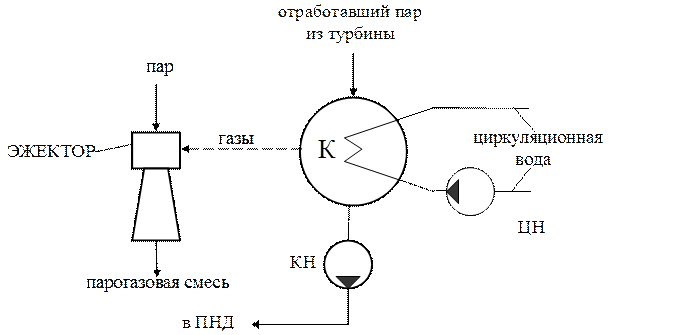 повышения мощности турбоустановки за счет увеличения разности между начальным и конечным давлением пара, а, значит, и теплоперепада на турбину. На рис. 26 показана общая схема конденсационной установки. В ее состав входят конденсаторы, конденсатные насосы и эжекторы. В конденсаторе происходит конденсация отработавшего в турбине пара при его соприкосновении с трубками, в которых течет охлаждающая вода, поступающая из системы технического водоснабжения электростанции. При конденсации объем рабочего тела значительно уменьшается, что и обеспечивает понижение давления. Кроме того, превращение пара в воду позволяет существенно снизить расход электроэнергии на собственные нужды ТЭС и АЭС, поскольку затраты энергии на транспортировку рабочего тела определяются прежде всего объемным расходом рабочего тела через перекачивающие агрегаты (насосы, компрессоры). Конденсатор обеспечивает в определенной мере и деаэрацию конденсата, так как процесс конденсации идет при параметрах насыщения. Трубки теплообменной поверхности конденсатора изготавливаются из латуни. Она обладает высокой теплопроводностью, что особенно важно для максимально возможного приближения температуры конденсации пара к температуре охлаждающей воды и тем самым снижения давления в конденсаторе. Производительность конденсатных насосов (КН) выбирается исходя из полной нагрузки турбины в летний период, когда температура охлаждающей воды наиболее высока. Давление КН определяется гидравлическим сопротивлением всего конденсатного тракта – от конденсатора до деаэратора. Привод насосов – электрический. При наличии полной очистки турбинного конденсата применяется двухподъемная схема включения конденсатных насосов, когда фильтры конденсатоочистки расположены между двумя ступенями КН (рис. 4). Насос первой ступени преодолевает сопротивление этих фильтров, а насос второй ступени – сопротивление конденсатного тракта (до деаэратора). Отметим, что на КЭС 100%-ная очистка конденсата турбин считается обязательной. В отношении АЭС это обусловлено повышенными требованиями к герметичности теплообменных поверхностей парогенерирующих установок. Что касается современных ГРЭС, то там используются прямоточные котлы, требующие более высокого качества питательной воды по сравнению с барабанными котлами ТЭЦ, имеющими продувку. В тепловых схемах мощных турбоустановок ГРЭС конденсатоочистку принято называть блочной обессоливающей установкой (БОУ). Резерв для конденсатных насосов обычно устанавливают из расчета: на два рабочих один резервный КН, обеспечивающий в случае необходимости до 50-60% суммарной нагрузки.