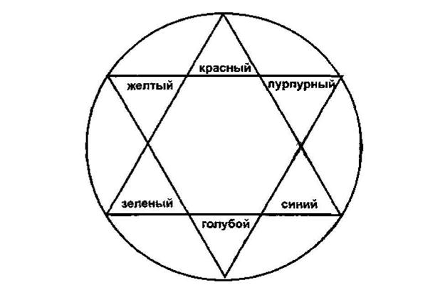 Рис.2.7. Цветовой круг показывает взаимосвязь моделей RGB и CMY Таким образом, цвет каждого треугольника на рис. 2.7 определяется как сумма цветов смежных к нему треугольников. Но из-за необходимости добавлять черную краску, процесс преобразования становится значительно сложнее. Если цвет точки определялся смесью цветов RGB, то в новой модели он может определяться смесью значений CMY с включением некоторого количества черного цвета. Для преобразования данных модели RGB в модель CMYK программа цветоделения применяет ряд математических операций.