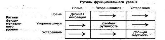 Следует, однако, отметить, что во всех современных методах формальный аппарат проектирования эффективных организаций имеет вспомогательный характер, лишь дополняя целенаправленную работу квалифицированных экспертов, руководителей и членов организаций. Вместе с тем основная слабость этих подходов состоит в подмене проблемы создания полной организационной системы рассмотрением лишь некоторых ее сторон. Необходимо сформировать комплексное представление о составе, содержании и условиях формирования эффективных организаций. Таким образом, обобщая все вышесказанное, можно сформировать комплексную теорию формирования эффективной модели организации (промышленного предприятия). Для формирования такой модели следует, на наш взгляд, объединить эволюционную, ситуационно-конфигурационную, эколого-биологическую и системно–интеграционную модели. В качестве элементарной единицы внутренней среды предприятия следует принять «организационную рутину» как носителя наследственных признаков организации и источник организационных изменений при изменении параметров внешней среды с целью выживания и адекватной адаптации в ней. Современная парадигма жизненного цикла предполагает, что развитие есть схематическая последовательность состояний организации, разделяемых моментами трансформации, позволяющими выделять различные периоды в её развитии. Главный фокус исследований в большинстве трудов, посвященных жизненным циклам, - это характер эволюционных изменений, количество стадий, их особенности и продолжительность. Необходимо, на наш взгляд, согласиться с мнением Е. Попова и Н. Хмельковой, что «теория жизненного цикла организации нуждается сегодня в серьёзном пересмотре с новых системно-интеграционных позиций, позволяющих получить не только ответы на вопросы, как и почему эволюционирует организация, но и что в ней претерпевает изменения» [58]. Понимание организации как системы является аксиомой современной управленческой теории. Однако при разработке эволюционных подходов принцип системности не реализуется в полной мере. Организация в теориях жизненных циклов предстаёт как условно первичный элемент анализа, динамика её внутренней структуры системно не изучается. Признание сложности и неоднородности внутренней среды организации требует учёта системного принципа полидинамичности. Он означает, что «различные элементы внутренней среды организации характеризуются не только собственным «содержательным измерением», но и самобытной эволюцией, скорость которой неодинакова и не совпадает со сроками присутствия организации на рынке» [58]. Результаты исследования Дж. Коллинза продемонстрировали неоднозначность протекающих во внутренней среде организации процессов. Автор утверждает, что «выдающиеся компании сохраняют свои ключевые ценности и главный смысл, но их стратегии и тактики операционной деятельности адаптируются к изменениям в мире бесконечное множество раз» [36]. Поэтому необходимо изучение жизненных циклов внутренней среды организации с учётом структуры и особенностей ее отдельных элементов, характера их эволюции. Это позволит изменить понимание процесса развития организации как смены стадий жизненного цикла. Жизненный цикл организационной рутины согласно системно-интеграционному подходу включа