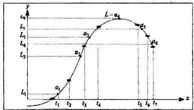 Рисунок 4.4 - Этапы онтогенеза производственной системы (ПС) (рисунок создан на основе [39]): точка t1 - рождение ПС; период t1 — t2 - рождение и процесс роста; t2 — t3 - период развития; t3 — t4 -расцвет; t4— t5 - зрелость ПС; t5 —t6 — процесс некоторого спада; t6— t7 - процесс разрушения; t7 — смерть ПС. Соединение на рисунке отрезков кривых через точки t1- t7 проведено по оси времени х, соответствующие точки L1, L2, L3 , L4 подвижного равновесия выполнения функций на каждом этапе обозначены аттракторами L по оси у на кривой онтогенеза точками: а1, а2, а3, а4, а5, а6 Складывается начальная (простая) форма организации. ПС ориентирована на действия, единолично управляется лидером – основателем, очень уязвима, полностью отсутствует организационная культура. Заканчивается кризисом продаж. На этапе развития t2— t3 рост продолжается, однако подструктуры ПС аллотропически, но согласованно видоизменяются, меняются их роль и значение, т.е. главное на этом этапе состоит в том, что совершенствуется и развивается структура, которая приближается к наиболее развитой форме. В основном формируется потенциал ПС. При усл