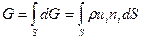 V. Перенос вещества через поверхность определяет нормальная составляющая скорости un, которая вычисляется как скалярное произведение векторов скорости и внешней нормали un=ui×ni=u× 1× cos(ui,ni). Если угол между вектором скорости и вектором внешней нормали острый, то скалярное произведение ui×ni положительно и, следовательно, вещество выносится через рассматриваемую площадку. Если же угол между вектором скорости и внешней нормалью к поверхности тупой, то скалярное произведение ui×ni будет отрицательным (косинус тупого угла <0); это значит, что через площадку dS жидкость втекает в контрольный объем. Объем жидкости, пронесенный за единицу времени через площадку dS, равен dQ=un×dS=ui×nidS, а масса жидкости, содержащаяся в этом проносимом объеме, будет равна dG=rdQ=r ui×nidS; это масса жидкости, перенесенная через площадку dS за единицу времени. Просуммируем теперь потоки массы, переносимые через элементарные площадки. Такое суммирование бесконечно малых потоков осуществляется интегрированием по контрольной поверхности S: