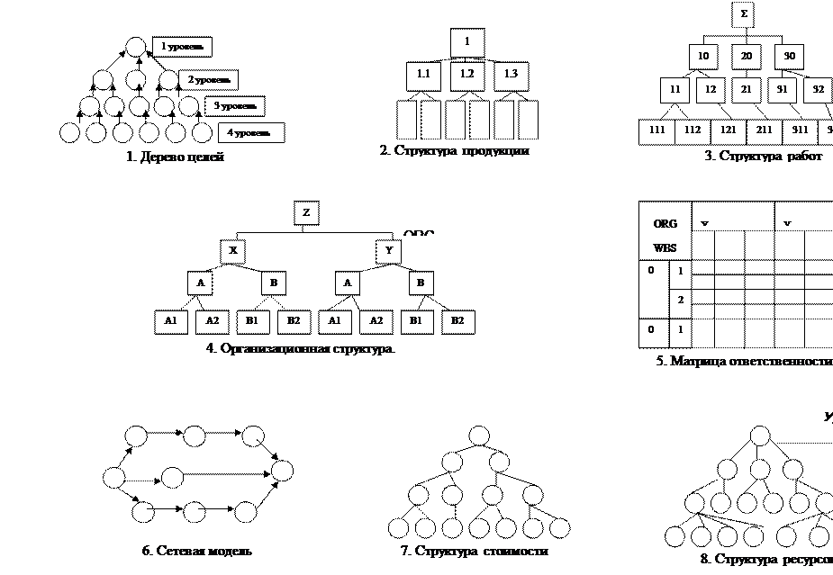 v Н. Окишио: «всякое техническое нововведение, приемлемое для капиталистов, повышает норму прибыли, если этому не противодействует рост заработной платы» v Ссудный капитал как отношение «кредитор – заёмщик» (т.е. отношение между капиталистами – не касающееся рабочего!!!) v Есть ли у ссудного процента (r) его «естественная цена»? v Маркс: «нет!», это результат игры спроса и предложения: 0 ≤ r ≤ P v Процент (в отличие от прибыли) в каждый момент задан извне (рынком) как единая величина (цена денег как товара) v Поэтому прибыль /даже на собственный капитал!/ делится на: v Ссудный процент (внешний фактор) v Предпринимательский доход (за личные усилия) Структура проекта —это организация связей и отношений между ее элементами строительные проекты, как правило, имеют иерархическую переменную структуру, которая формируется применительно к условиям функционирования Структура проекта призвана определить продукцию, которую необходимо разработать или произвести, и связывает элементы работы, которые предстоит выполнить, — как между собой, так и с конечной целью проекта. Кроме того, процесс структуризации проекта является неотъемлемой частью общего процесса планирования проекта и определения его целей, а также подготовки сводного (генерального) плана проекта и матрицы распределении ответственности и обязанностей. Основные задачи структуризации проекта: • разбивка проекта на поддающиеся управлению блоки; • распределение ответственности за различные элементы проекта и увязка работ со структурой организации (ресурсами); • точная оценка необходимых затрат — средств‚ времени и материальных ресурсов; • создание единой базы для планирования, составления смет и контроля за затратами; • увязка работ по проекту с системой ведения бухгалтерских счетов в компании; • переход от общих, не всегда конкретно выражаемых., целей к определенным заданиям, выполняемым подразделениями компании; • наличие комплексов работ (подрядов) В процессе структуризации проекта полезно использование следующих инструментов: Дерево целей — это графы, схемы, показывающие, как генеральная цель проекта разбивается на подцели следующего уровня и т. д. (дерево—это связанный граф, выражающий соподчинение и взаимосвязи элементов, в данном случае такими элементами являются цели и подцели). Дерево решений — граф, схема, отражающие структуру задачи оптимизации многошагового процесса. Ветви дерева отображают различные события, которые могут иметь место, а узлы (вершины) — точки, в которых возникает необходимость выбора. Дерево работ. На каждой стадии планирования необходимо разделить работы по проекту на части. Эта процедура известна как составление дерева работ проекта (WBS —Work Breakdown Structure). Организационная структура исполнителей. Схема организационной структуры проекта (CBS — Crganisation Breakdown Structure). Цель CBS состоит в указании не только исполнителей работ для каждого и ОВS, те. выделяются пакеты работ с назначенными для них исполнителями, что дает возможность подготавливать сетевой график узловых событий. Наконец, становится возможным разработать детальные сетевые графики. соответствующие узловым событиям и целям. Поскольку эти сетевые графики представляют не проект в целом, а его отдельные пакеты работ, они называются сетевыми блоками или подсетями.. Структура потребляемых